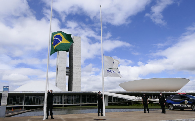 A Bandeira Nacional, em frente ao Palácio do Congresso Nacional hasteada a meio-mastro