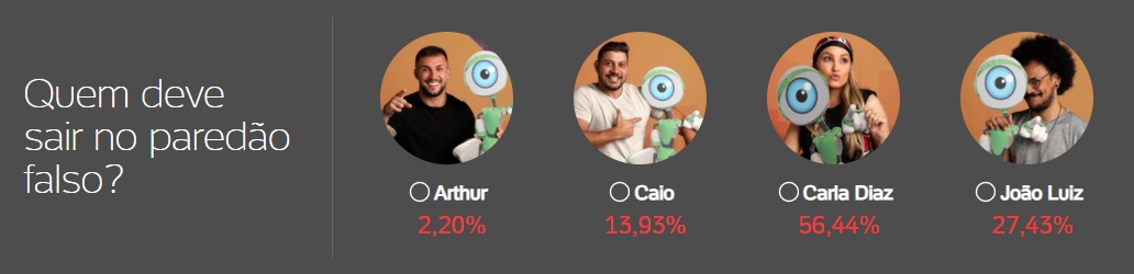 Na parcial da Enquete BBB UOL, nas primeiras horas desta segunda-feira (8), com mais de 50 mil votos, Carla Diaz liderava com mais de 55% dos votos. O menor percentual do paredão falso, de 2%, correspondia à porcentagem de Arthur.